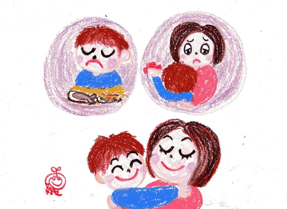 迎えに行ったとき、けんたは保育士さんに抱かれていた。私が「けんた!」と両手をだすと、一瞬さっと身体をひっこめた。再び両手をだすと、 「ママー!」と私の胸に飛び込んで、いつものようににっこりと笑った。愛おしく思った。