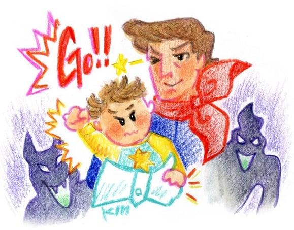 Every book he borrows from the school library is related to these. Naturally, he loves to go into "The Haunted Mansion" at Disneyland without fail. Even with his pre-research, he become horrified when he enters the house. In this type of situation, he depends upon his father, not mother.When they play heroes, the father plays always his enemy, but in this format, the father turns into the real hero! The father tries to hold up the son or holds his hands or peps him up. With the strong ally protecting him closeby, the son finally steped into his enemy's territory....